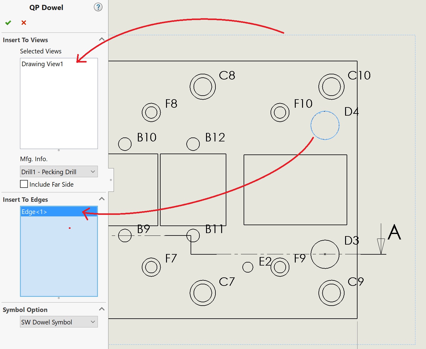2. Select the drawing view of the symbol to be placed and a circular edge, select the dowel symbol.