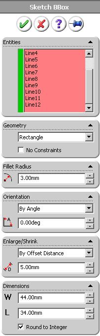 Entities – Select the geometry to be bounded, edge; external and internal sketch elements are allowed to select. Geometry – Select Rectangle or Circle to bound the Entities No Constraints – option to add relation to output Fillet Radius – Insert the corner fillet radius for box Orientation – Set the orientation of the bounding box None – Create an optimised box. By angle – Input the alignment angle of the box By Reference – Select a line to for the angle Enlarge/Shrink – Automatic add offset Distance or percentage to result Dimensions – Prompt the Width & Length of the box going to be created and allows user to change its size before the sketch is created. Round to Integer – Option to Round the dimension. Note: No interference detection for corner fillet! |