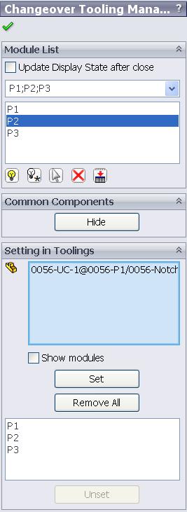 • Module List - Select the list of modules that components is going to set to. • Module - The current selected module o Show - show components of selected module o Hide All - hide all components o Select - select components of selected module o Delete - delete selected module from module list o Export - export current module list to a text file • Common Components – hide and show common components • Setting in Toolings – components selected to be set to a module o Set - set the components to the selected module o Remove All - remove all current module setting of the selected components |