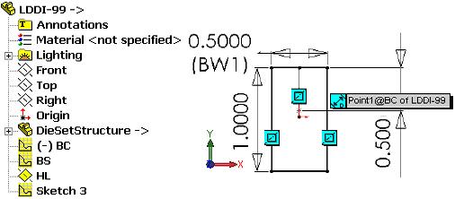 22. Create a sketch on HL Plane as following. Name the horizontal0.5 dimension to BW1. Name it to Sketch 3