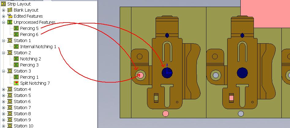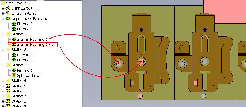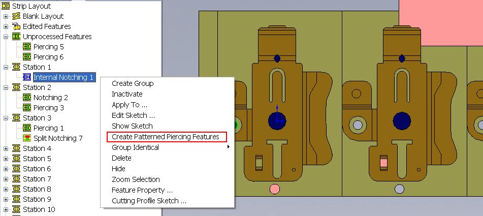 When there are piercing features of the same size and shape, the Create Pattern Piercing Feature function can be used to copy the internal notching feature to other similar piercing features.