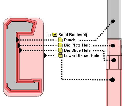 The created punch is a multi-body part with body to create dieset holes.