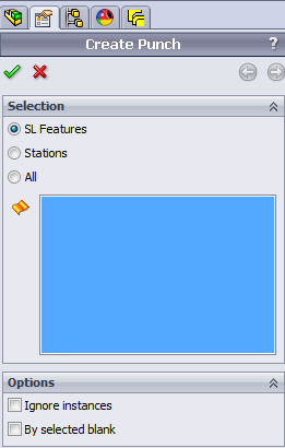 Selection SL Features set output limited to the selected punches Stations option automatic select all punches belong to the station at which the 1st punch is selected All option appends all cutting punch to the selection box Options Ignore instances create only the selected cutting punch instead of all instances in a pattern. By selected blank create only the cutting punches of the selected blank. |
