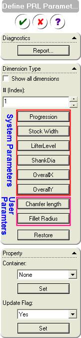 Restore – Reset all data Container – Assign component to UC/MC/LC of dieset assembly Update Flag – If it is set to Yes, 3DQuickPress will update the parameters when this PRL is inserted to punch design assembly |