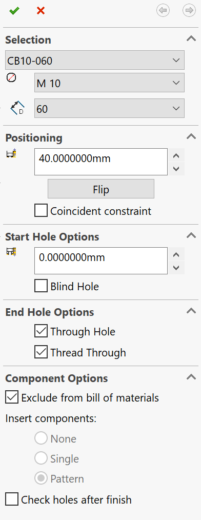 Component Options Exclude from BOM – exclude the inserted component from BOM Insert component options: None – no component is inserted and only component hole is created Single – components are inserted as single component Pattern – components are inserted as a feature driven pattern Check holes after finished - check hole condition after function finished |