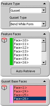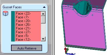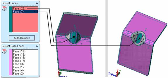 Feature Faces – The gusset faces can be selected one by one or if they are too small, select the base faces and select each side a seed surface here Gusset Base Faces – Gusset Base Faces bound the gusset. This is only used for Auto Retrieve Auto Retrieve - By selecting bounding face and seed face properly, Gusset faces are selected automatically |