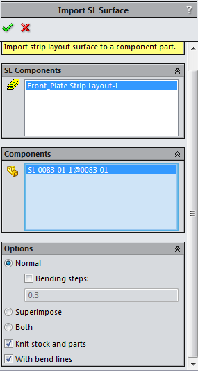 This function is used to import strip layout surface to any component in the dieset. This function should be used whenever the strip layout part is modified so that the latest strip layout is imported to the SL in dieset. The old surface in SL will be kept for future reference.