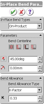In-place Bend Types – The bend is apply to the stock or part Parameters-Enter the bend position, angle, and internal bend radius Bend Allowance-Input the bend allowance calculation method |