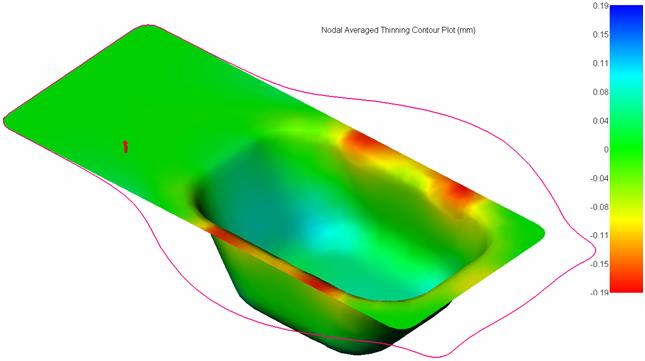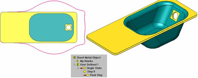 The following deep draw part has a hole which should be pierced after forming in order to keep the precision. Although the blank result from 3DQuickPress is in pear shape, we use a projection for the blank as the final size of the part will be cut to size after forming.