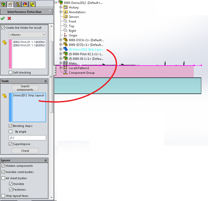 - In Tools selection box, select strip layout file from fly out assembly tree(cannot select from graphic window). Or click Search components button to search for interfered components autoamtically.