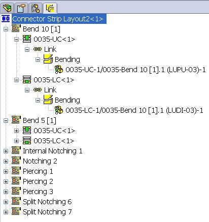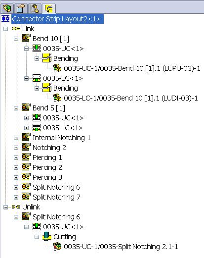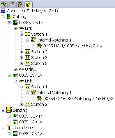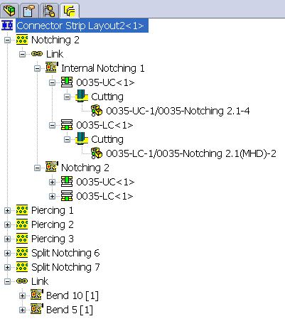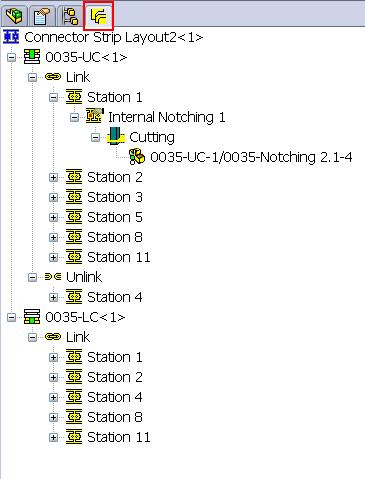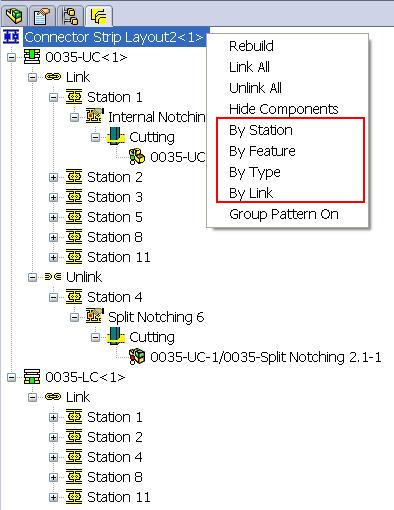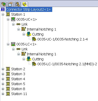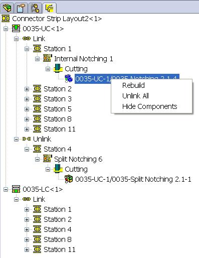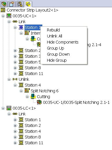 Link Manager Design Tree is created after the punch design assembly is created. It lists all the link information between any created component and strip layout features. All the icon in the tree have shortcut menu to link/unlink the component.