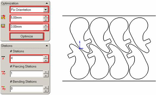 Select Fix Orientation; 5 mm for stock margin; 3 mm for minimum station distance (same as the setting in nesting minimum blank distance); 4 for number of station; and click Optimize.