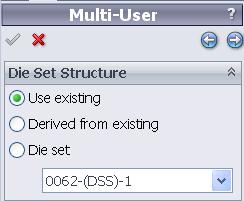 • No. of Users - number of users to be added to current master punch design • Stations - define stations to be controlled by each new user • Die Set Structure - select to use new die set structure or existing one o Use existing - use the existing die set structure of the punch design o Derived from existing - use a new die set structure that is derived from the existing one o Die Set - set the die set structure to use in the list Die Set Center - select to use new die set center or existing one o Use existing - use the existing die set center of the punch design o Derived from existing - use a new die set center that is derived from the existing one o Die Set - set the die set center to use in the list