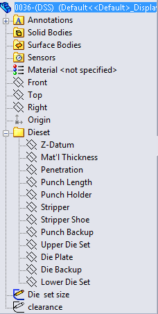It was derived from the diesetstructure.sldprt from the selected DiesetAssemblyTemplate folder. Information inside this part is shared by all dieset components and the associativity is driven by the reference planes and the sketches. Never create external reference inside this document! Only use it to drive others. Reference Planes represents the dieset structure, the most important planes are Penetration and Punch Length which controls the die shut height. Dieset size sketch used to drive the die plate size. Clearance sketch is used to record the assembly clearance between plates and punches. Click 3DQuickPress, Dieset Structure, Component Hole Clearance to check and set the clearances before create any punches. |